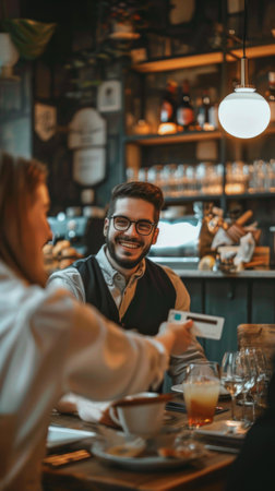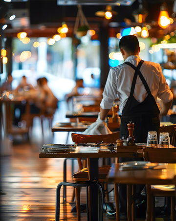 A waiter prepares tables in a cozy restaurant filled with warm lighting and diners.
