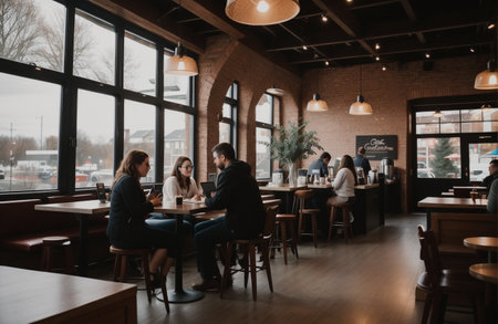 Cozy urban cafe bustling with customers enjoying meals and conversations during a relaxed afternoon