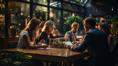 Group of friends enjoying coffee and conversation in a modern cafe