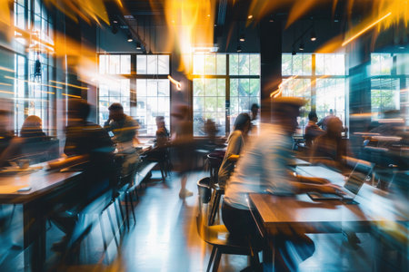 Motion blur captures the dynamic atmosphere in a bustling co-working space filled with professionals and entrepreneurs