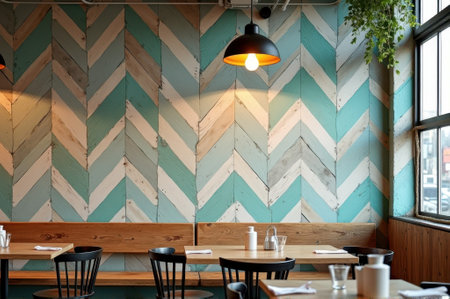 Cozy cafe interior with herringbone patterned walls and warm lighting. That the image is generated using AI.