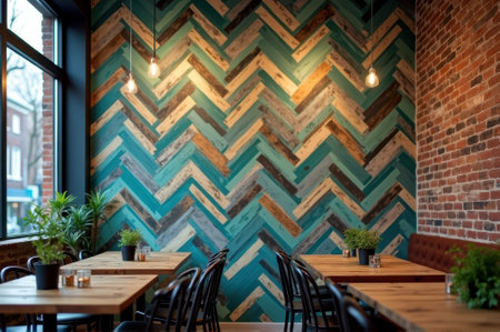 Cozy modern cafe with chevron wood wall and warm lighting. That the image is generated using AI.