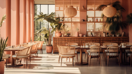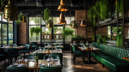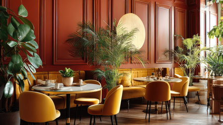 This image showcases a stylish restaurant interior featuring warm colors, elegant furniture, and lush greenery, creating an inviting atmosphere perfect for dining.