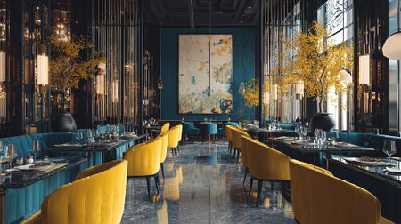 A luxurious restaurant interior with yellow chairs and blue tables set for dinner