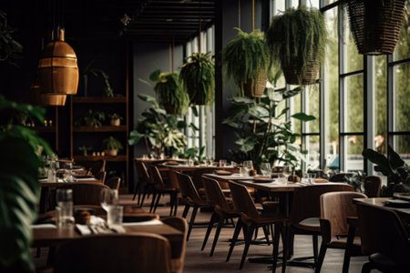 Interior of a modern restaurant with tables, chairs and decorative plants