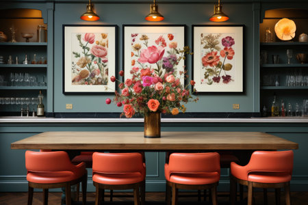 An AI generated illustration of a cozy restaurant features vibrant orange chairs and vibrant wall art, creating a welcoming atmosphere for patrons