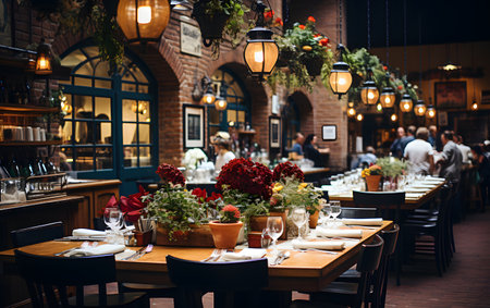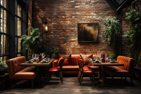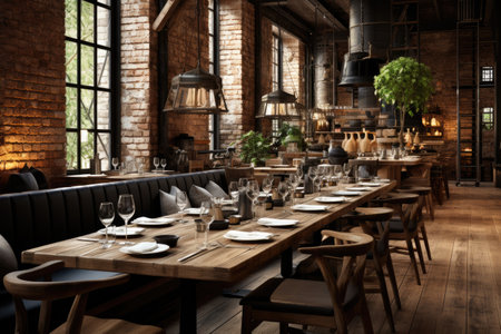 Blurred background of loft restaurant interior with wooden tables set with glasses and plates, and exposed brick walls. Perfect for showcasing restaurant promotions, or hospitality branding
