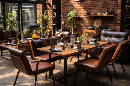 interior of modern loft cafe with brick walls, wooden floor and brown leather chairs