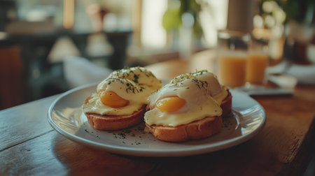 A delectable breakfast featuring perfectly poached eggs drizzled with rich hollandaise sauce on toasted buns, garnished with herbs and served in a cozy dining setting.