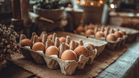 A serene arrangement of brown eggs in cartons set on a rustic table, surrounded by natural elements and soft lighting, evoking a warm and homey atmosphere.