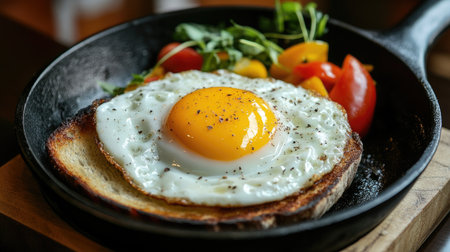 Sunny-side up egg on a skillet with crispy edges, served with toast and fresh vegetables for breakfast.