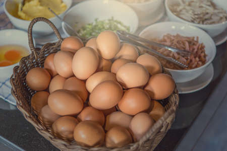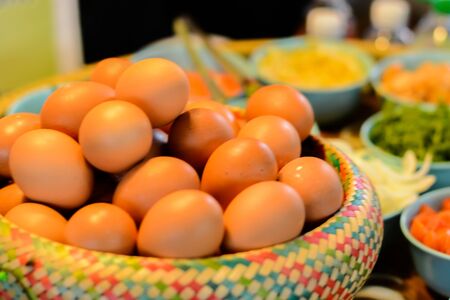 kitchen table with eggs on basket, focus from top view kitchen table.