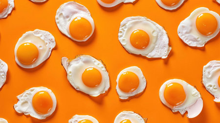 Pattern of sunny side up eggs, vibrant orange backdrop, food repetition, overhead flatlay