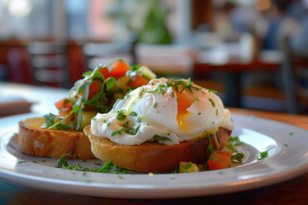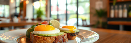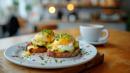 Delicious brunch featuring poached eggs on avocado toast served in a cozy cafe setting in the morning