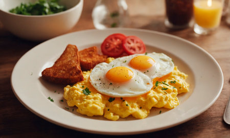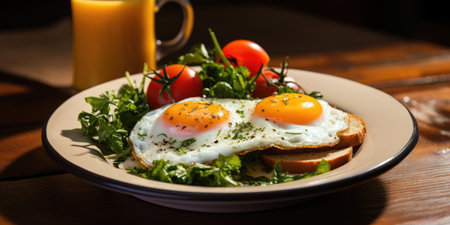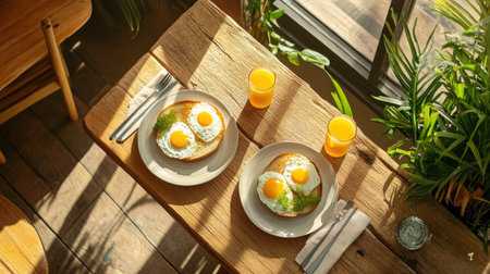 A delightful breakfast scene featuring plates of eggs and orange juice, set in a cozy dining area. The warm sunlight enhances the inviting atmosphere.