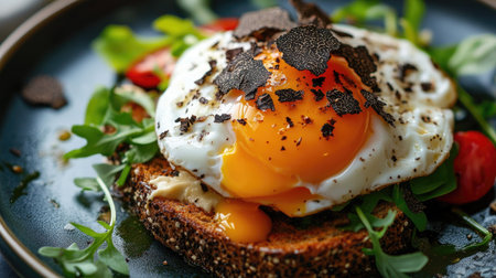 Fresh truffle mushrooms shaved over a poached egg on toast, with vibrant colors.