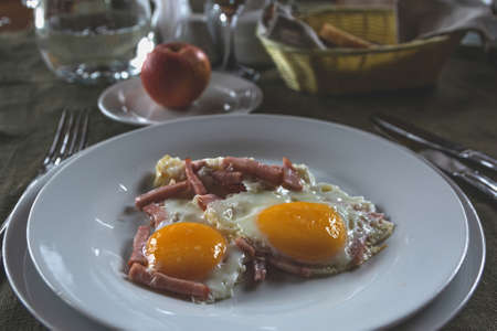 Fried eggs with bacon in a plate on a wooden table, selective focus, side angle view.