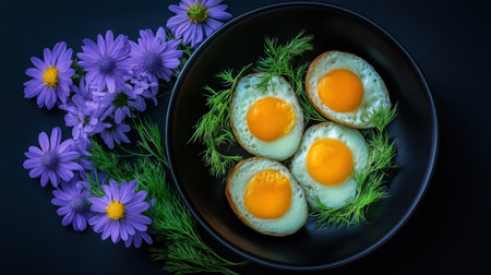 Fried quail eggs in a beautiful plate on a dark table background. Fried eggs with tomatoes and dill. Tasty and healthy breakfast. Close-up. Fried eggs close-up.
