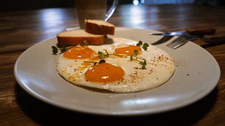 Tasty breakfast. Fried eggs with herbs. High quality photo