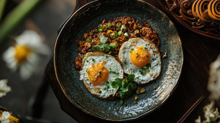 Artistic Thai food styling of fried eggs with sweet tamarind sauce, bright herbs, and carved scallion curls on ceramic plate