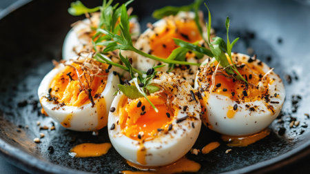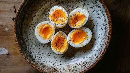 Hard-boiled eggs arranged on a ceramic plate, halved to display bright yellow yolks, with a pinch of black pepper for flavor. --chaos