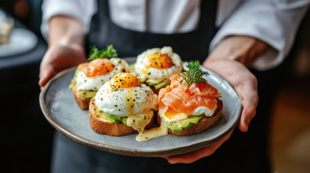 Elegant breakfast tray held by a waiter, featuring Eggs Benedict with smoked salmon, poached eggs, toast, and avocado, perfect for a gourmet restaurant menu