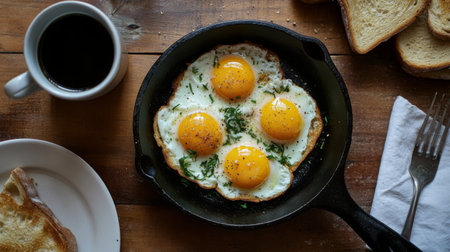 An inviting breakfast table featuring a cast iron pan filled with fluffy fried eggs, garnished with herbs and served alongside fresh toast and coffee, showcasing a delightful morning spread.
