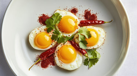 A beautifully arranged plate of pan-fried eggs, highlighting the rich yellow yolks and perfectly cooked whites, garnished with fresh cilantro and chilies.