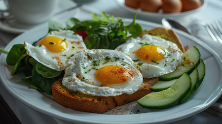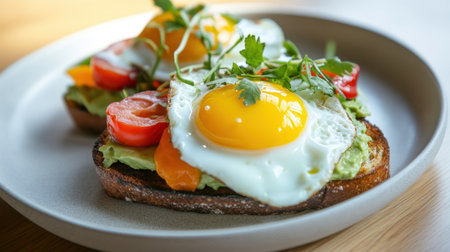 Delicious avocado toast with sunny side eggs, herbs, and vibrant veggies on ceramic plate with natural lighting
