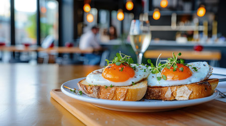 A vibrant breakfast featuring perfectly fried eggs on toasted bread, garnished with fresh herbs, set in a stylish cafe with modern decor and warm lighting.