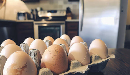 A dozen fresh eggs neatly arranged in a carton are displayed on a kitchen counter with modern interior design elements in the background