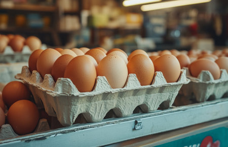 Fresh eggs neatly arranged in cartons, displayed on a table at a local market stall