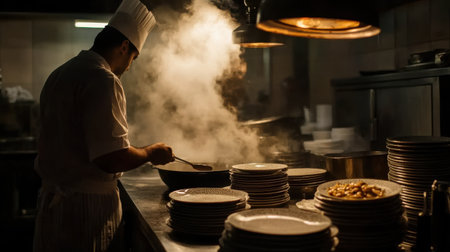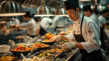 A chef skillfully prepares fresh dishes in a bustling kitchen, showcasing vibrant vegetables and steaming bowls. The atmosphere embodies culinary passion and expertise.