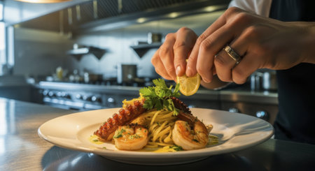 Chef hands squeezing fresh lemon onto a plate of gourmet seafood pasta with octopus and shrimp, highlighting culinary art and professional cooking.