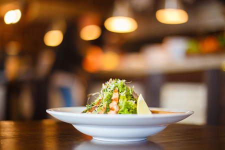The side portrait of the salad in the form of the piramide consisted of the grilled trout, lettuce, lemon and decorated with parmesan cheese at the blurred background of the restaurant