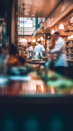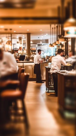 Blurred restaurant background with some people eating and chefs and waiters working. Generative AI