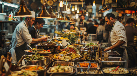 A photo set in a bustling market offering a variety of global cuisines, where chefs and food enthusiasts of different ethnicities share their culinary traditions, celebrating diversity through food.