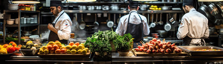 Chefs working in a busy kitchen, fresh ingredients on the counter