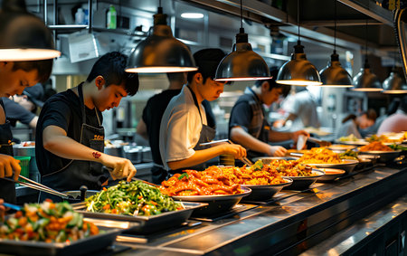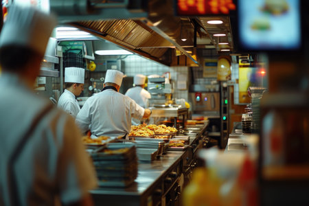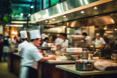 Generative AI, busy chefs working on the restaurant kitchen, blurred background