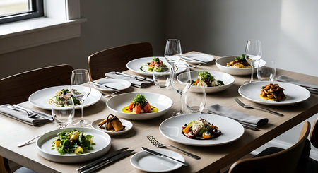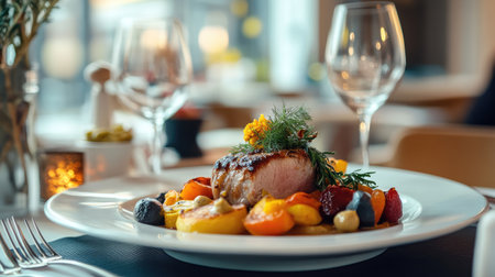 Elegant luxury dining with gourmet cuisine and wine in a cozy restaurant. Culinary delight captured in ambient lighting. Food catering and English cuisine