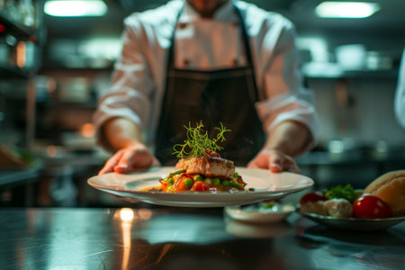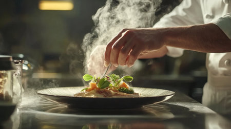 A chef plating a gourmet dish in a professional kitchen, with a focus on the delicate presentation and garnishing.