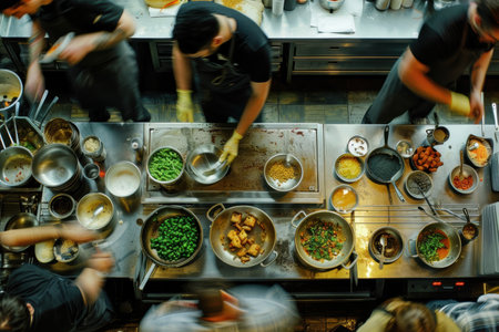 Generative AI, busy chefs working on the restaurant kitchen in motion blur, speed photo