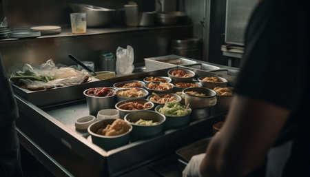 Men and women preparing fresh gourmet meals in commercial kitchens generated by artificial intelligence