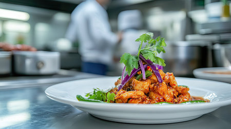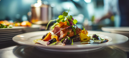 Exquisite plated dish features carefully arranged roasted vegetables, herbs and protein on a white plate, set in a kitchen environment, creating a culinary presentation ideal for food blogs and gourmet restaurant marketing.