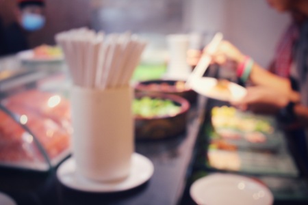 An inviting blurred vegan salad bar with fresh vegetables and trendy decor