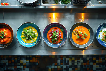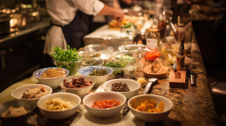 A vibrant array of fresh ingredients arranged on a professional kitchen counter, showcasing culinary preparation for a gourmet meal in a bustling kitchen.