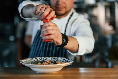 A talented chef meticulously garnishes a gourmet dish with fresh herbs and colorful ingredients, showcasing artistry in modern cuisine and culinary excellence.