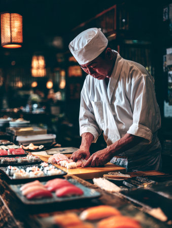 Skilled sushi chef in white uniform working behind a counter in an authentic Japanese restaurant. Various fresh sushi pieces and rolls displayed in foreground with warm, moody ambient lighting.