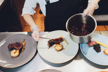 Close-up of chef in protective gloves decorating the delicious dish on the table before serving at the restaurant
