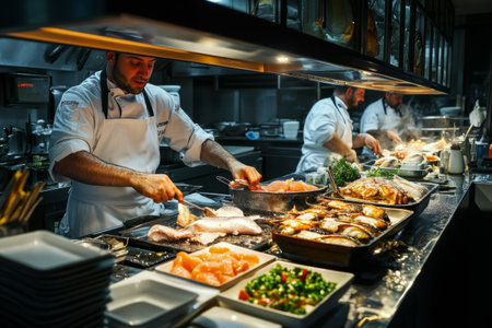 Chefs are diligently working in a bustling seafood kitchen, skillfully preparing a variety of fish dishes. Steam rises as they chop, season, and arrange fresh ingredients for service.